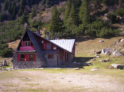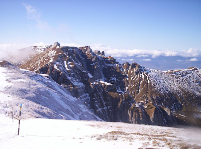 Fusese cam ger noaptea trecută, şi acum era încă foarte frig.. Aşadar coborârea va fii tot pe horn, măcar aici ştim ce ne aşteaptă. Eu îmi doresc foarte mult să mai stau pe sus, soarele încă străluceşte, liniştea care ne înconjura apoape că îţi dădea impresia că îţi ţiuie urechile. Dar nu am mai stat prea mult.. Din păcate, nu s-a putut.. I-am lăsat pe cei cu care eram să se duca înainte iar eu am ramas cu Florin în urmă. Am bagat căţeluşa în rucsac deoarece nu mai voia să coboare. A stat cuminte, mai gâfâia din când în când, dar cred că din cauza faptului că aţipea. Ajunşi la cabană, ne-am pus pe mâncat. I-am dat şi căţeluşei.