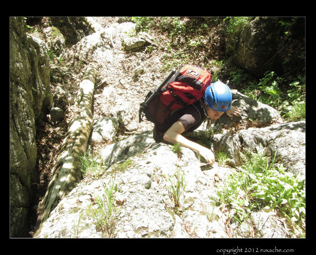 Încă o săritoare.La fel de udă, de fapt chiar mai udă, imposibil de trecut prin cățărare de oameni normali. Mă înfig iarăși într-un horn, mă târăsc iarăși ca molusca și ajung aproape sus, numai că trebuie să iau și rucsacul lui Andrei care este mai mare și nu va putea trece cu el pe aici cum am trecut eu.