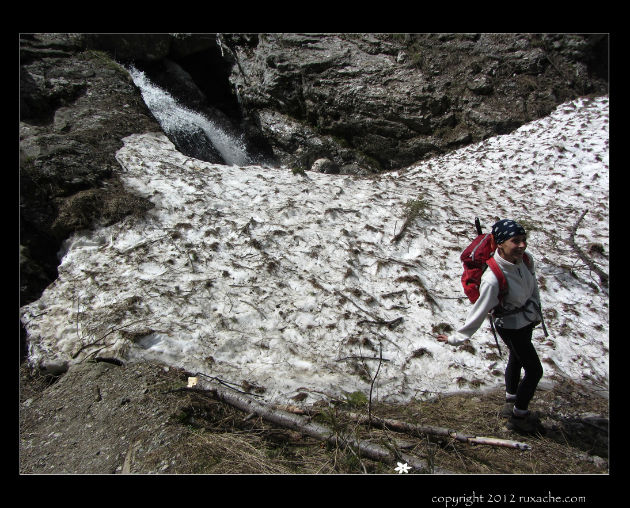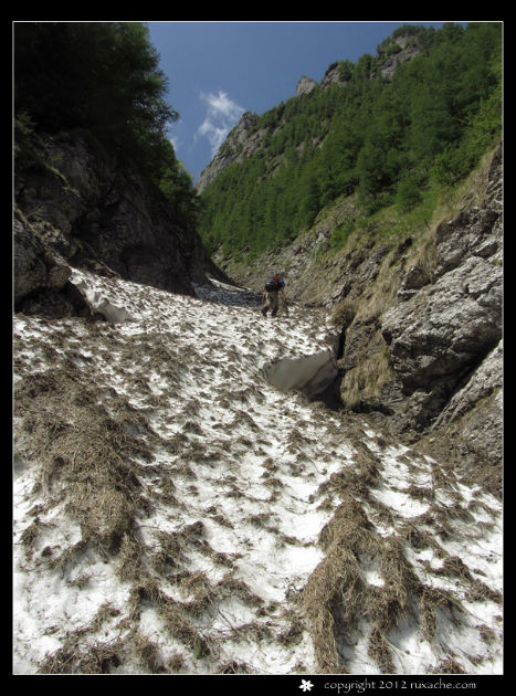 Puțin mai sus dăm și de zăpadă. Nu pot să zic că nu mă așteptam la asta, dar nu mă așteptam însă la atât de multă. Încă o dată am confirmarea că iarna asta a nins foart mult. Prima limbă de zăpadă este scurtă iar înclinația pantei este mică, așa că nu necesită scoaterea pioletului.