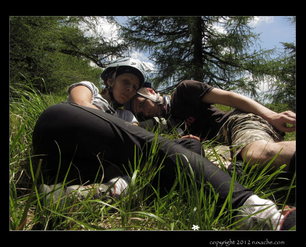 Mai este destul până sus, dar dispare zăpada și urcăm pieptiș o pantă care scoate untul din noi. Uraaa, ajungem în șa unde ne prăbușim pe iarbă printre copaci.