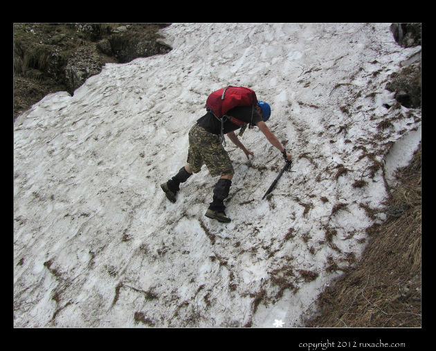 Sus arucasem deja rucsacul așa că mă pregătesc să scot coarda și să îl asigur pe Andrei când observ că a prins curaj și urcă singur. Dar evident se blochează. Las coarda, îi întind un piolet care îmi scapă din mâna udă. Stupid stupid stupid. Nu se lovește nimeni. Prind pioletul mai bine, i-l întind și imediat este și el lângă mine.