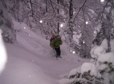 Am mers un pic pe urmele lor dar am trecut destul de repede şi noi în faţă la tăiat potecă. O bună bucată de drum am mers cu ei, am înotat prin zăpada care în unele locuri îmi ajungea pana la şold, am râs, am glumit şi ne-am gândit cu nerăbdare la ceaiul cald pe care îl vom bea sus la cabana Caraiman. La un moment dat cei doi au decis să se întoarcă.