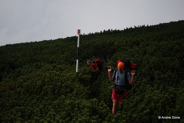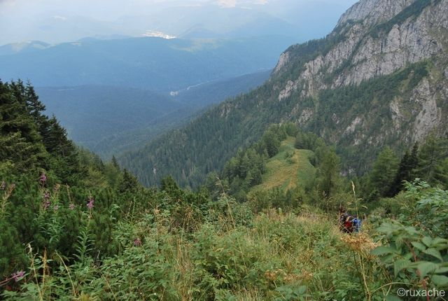Coborârea e interesantă, îţi oferă o altă perspectivă faţă de urcuş, aşa că spre final bălăurim un pic prin jnepeni, suficient cât să calc strâmb cu glezna mea buşită. Auuuuuuuuuu!!!!!!