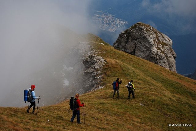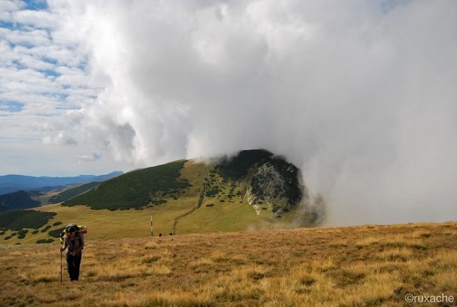 Şi mergem agale şi privim norii care vor să intre în Bucegi. Momentan stau proptiţi de pereţii de abrupt şi par că se chinuie să rupă o barieră invizibilă şi să invadeze platoul. Şi curând reuşesc. Suntem din când în când învăluiţi de ceaţa deasă, care trece peste noi şi lasă loc altui nor să se plimbe pe poteci.