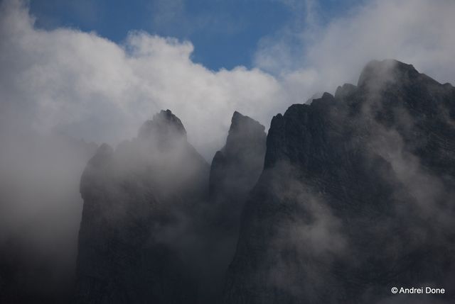 La popas, Acele Morarului ni se arată grandioase din ceaţă. Tot muntele fumegă.