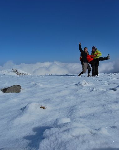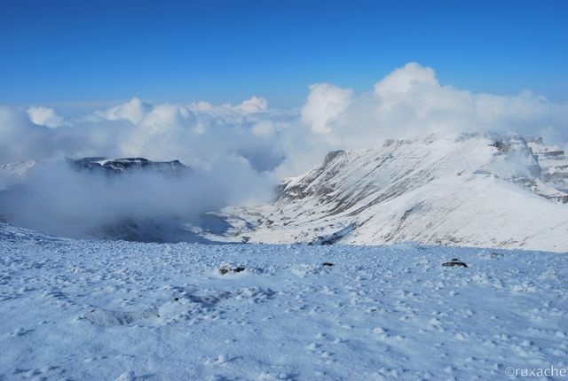 Şi-am avut şi marele noroc să se dea norii ăia pufoşi la o parte. Şi-am avut un fel de mare de nori, cu o oarecare primă zăpadă, cu tot muntele albit pudrat uşor ca o prăjitură cu bezele. Lipseau numai zurgălăii şi bradul împodobit.
