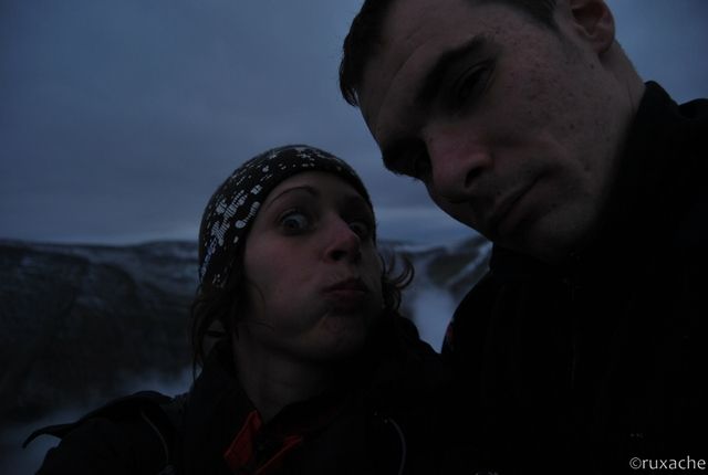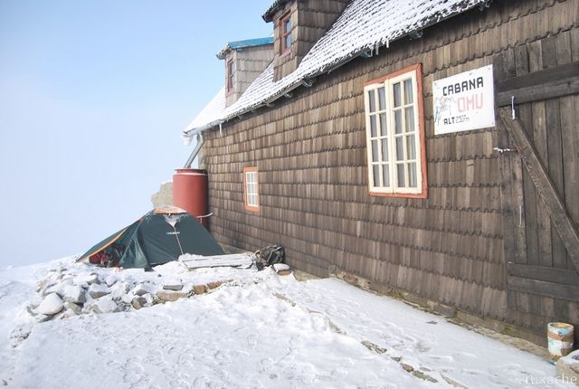 Mai bine nu ştiam. Pentru că evident, în scurt timp punem cortul (fix în faţa cabanei big grin), ne băgăm în sacii de dormit şi exact înainte să adormim, se aud afară zgomote de paşi în zăpada îngheţată şi … un fel de respiraţie grea laughing Da, habar nu am cum să pun asta în cuvinte, un puf, un grof mof fof grr mâf. Ceva de genu. Ăla era ursu. Şi dă-i şi ţipă şi strigă şi ieşi cu frontala să-l ocheşti. Numa că nu se vede la mai mult de 3 m, e ceaţă şi viscoleşte.