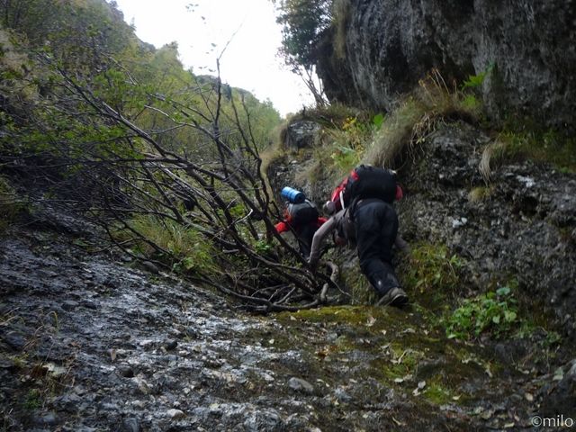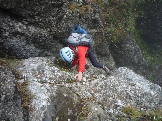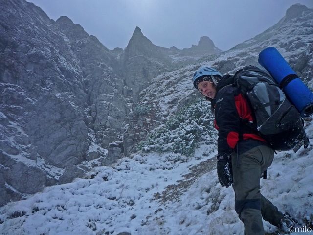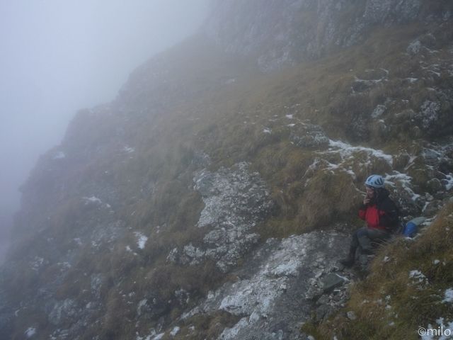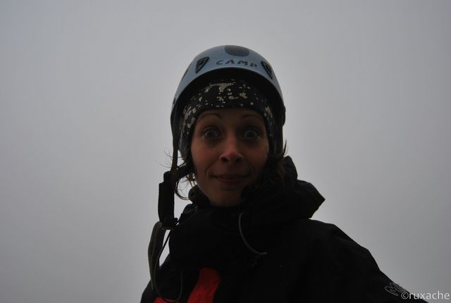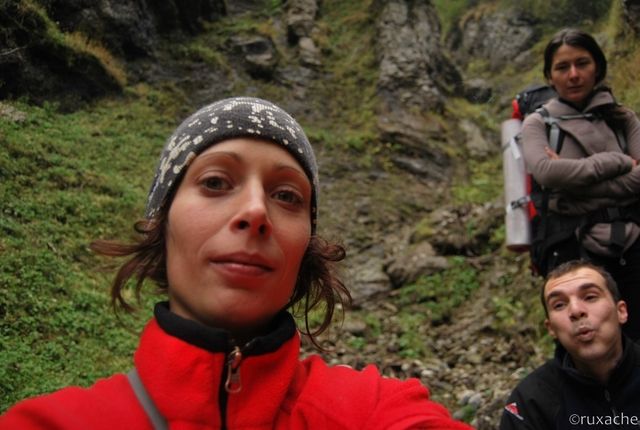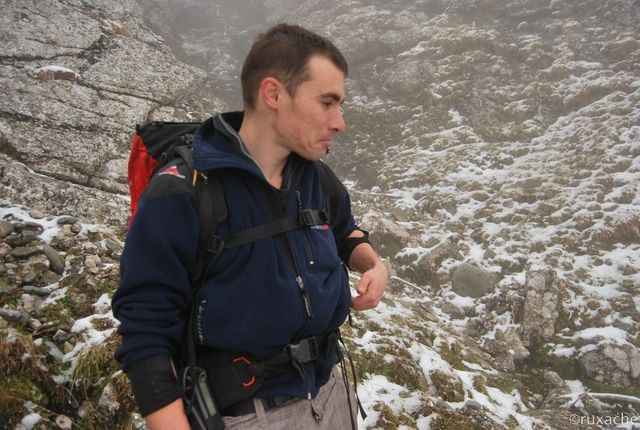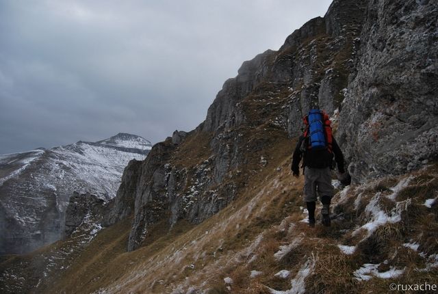 Cu mine în faţă intrată pe viteza a 5-a, cu Simona la mijloc mai uşurel şi cu Andrei în spatele ei mai cu o încurajare, mai cu un împins de rucsac, mai cu ocolit pe ici colo câte o săritoare, câştigăm altitudine. Ne mişcăm destul de greoi şi pur şi simplu mi se învineţesc buzele de frig când trebuie să îmi aştept coechipierii. Dârdâi de frig și în toată bucuria de a cățăra și de a fi pe munte, nu pot să nu mă gândesc pe ascuns la un ceai fierbinte și un loc cald și uscat.