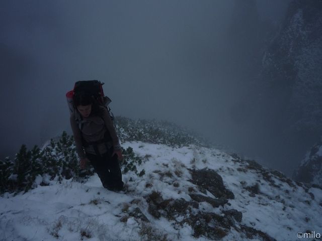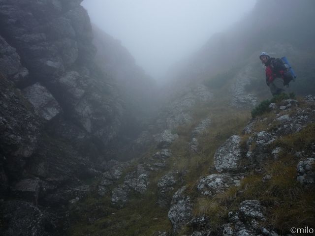 Din când în când se mai dă şi ceaţa la o parte. Iată că firul văii se desparte în trei. Alegem varianta cea mai uşoară, cea din stânga, pentru a mai economisi nişte timp şi destul de repede, cocoţând feţe înclinate şi acum, pline de zăpadă, reintrăm în firul principal. Ne dăm seama că nu avem nicio şansă să terminăm traseul pe lumină în ritmul ăsta, aşa că golim rucsacul Simonei de toate cele laughing şi reuşim să impunem un ritm oarecum mai alert.