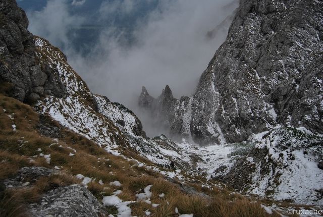 Am coborât pe Valea Cerbului, cea lungă cât trei zile de post negru. Dar de data asta a fost mai frumos. Am mers cu ninsoarea şi cu lapoviţa-n cap, am avut ceva ceaţă pe crestele de împrejur şi-am luat masa sub bolovanul din Valea Priponului.