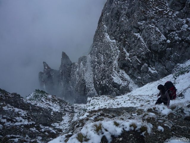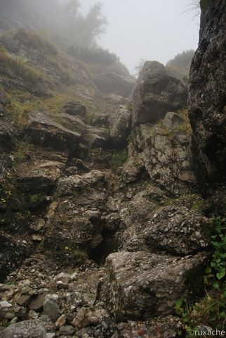 Am ajuns la confluenţa cu Valea Adâncă. Ceaţa se risipeşte, frigul parcă dispare, creasta Morarului ne face cu ochiul semeaţă şi noi trebuie să urcăm pe un vâlcel cu grohotiş, o faţa super înclinată cu iarbă şi petice de zăpadă gata îngheţată.