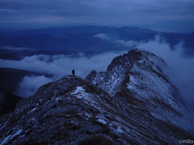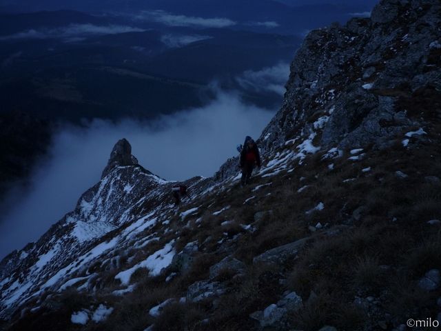 Creasta Morarului ne primeşte odată cu ultimele frânturi de lumină. Mergem fără frontale şi admirăm luminiţele de jos.